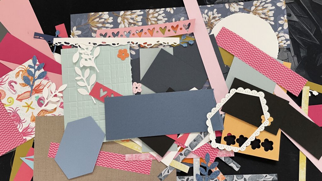 Oben im Bild siehst du meine gesammelten Werke äh Reste. Die habe ich erstmal auf meinem Tisch ausgekippt und versucht etwas zu sortieren. Nach Papieren, nach Stanzteilen und auch ein wenig nach Farben. Für meine Verhältnisse war da ganz schön viel Rosa dabei, wo ich doch eigentlich Team Blau bin… sehr merkwürdig. (Kleiner Spoiler die Projekte die ich dann gebastelt habe waren wieder mehr blau …:) )